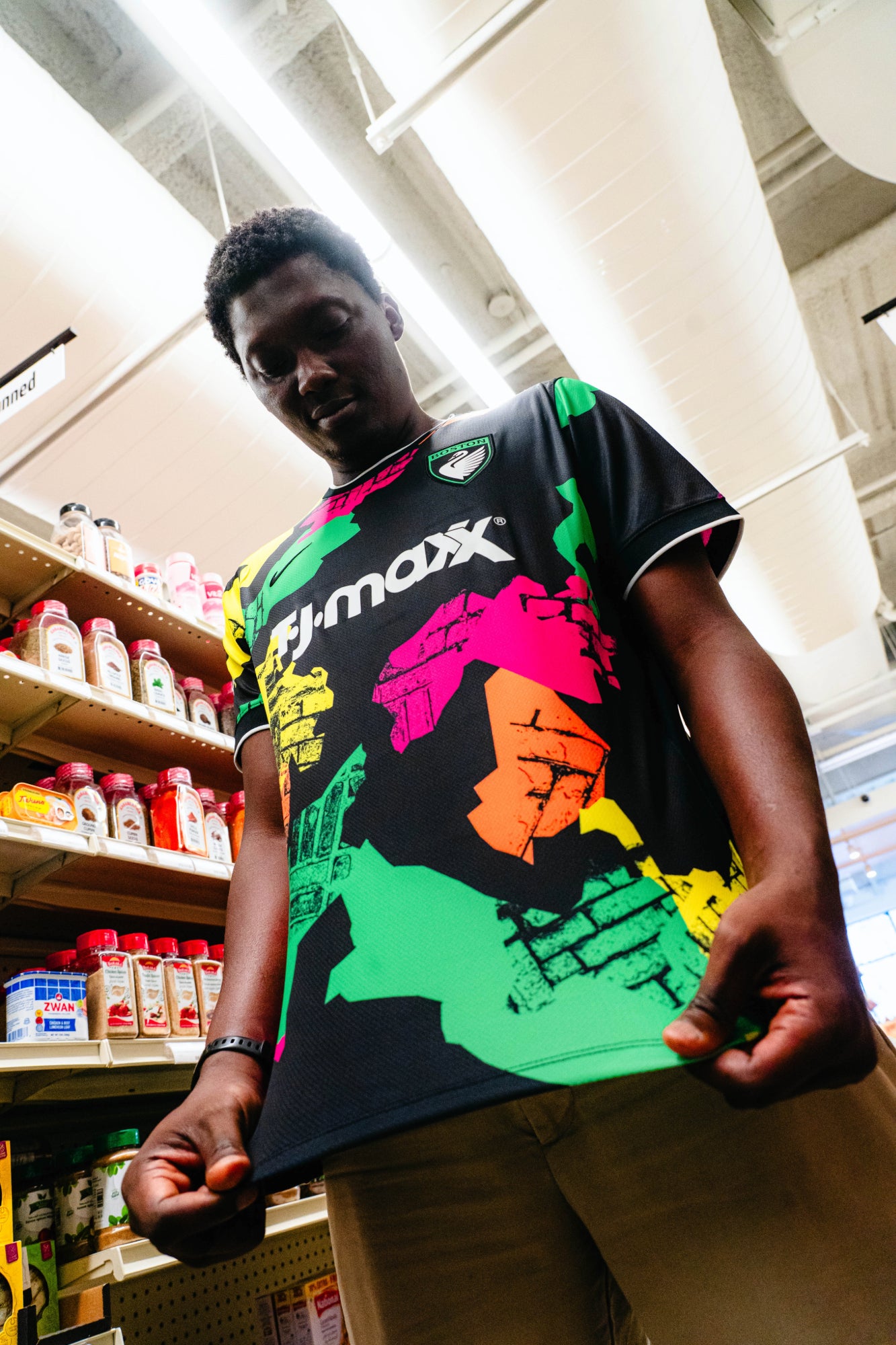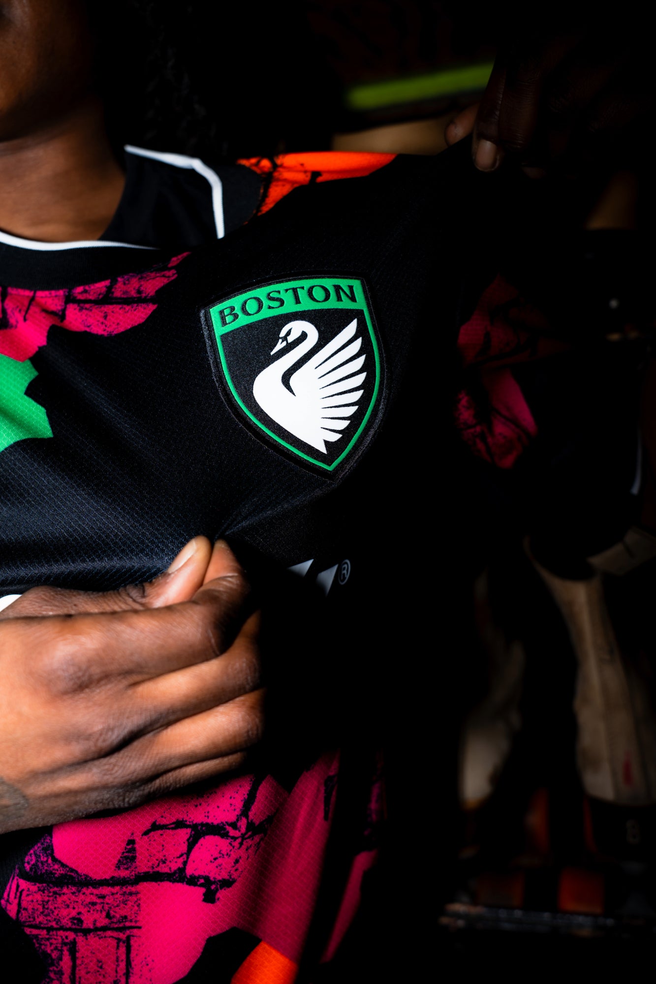 Introducing the Common Ground Kit from Nike — Boston Legacy FC’s 2026 secondary jersey. Set against a bold Pitch Black base, the design features a layered collage inspired by Boston’s neighborhoods, with hits of Fuchsia Flash, Legacy Green, Dynamic Yellow, and Cone Orange emerging through striking negative space.